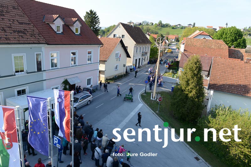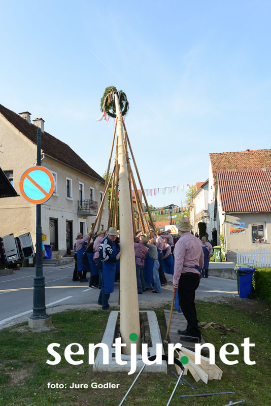Šentjur, 21. 4. 2017 – Po svečani akademiji Mestne skupnosti Šentjur se je za organizatorje Šentjurjevega začel precej stresen vikend. Dogajanje v Zgornjem trgu se je začelo s simboličnim premagovanjem zmanja in triumfom svetega Jurija. Seveda je dogajanje budno spremljal in komentiral naš župan Gustav Ipavec, ki ga že tretje leto upodablja Luka Žerjav. Osrednji del otvoritve pa je postavljanje mlaja. Tokrat je smreko velikanko, ki je merila 3 cm manj kot 30 metrov, iz kamenškega gozda doniral Drago Kovačič. Za postavitev mlaja pa so združili moči fantje iz Svetega Štefana, Kamenega, Botričnice, Loke pri Žusmu in Gorice pri Slivnici. Za likof so poskrbele gospodinje iz Kamenega in Zgornjega trga. Za vino je poskrbel Zdenko Horvat in ga radodarno ponujal obikovalcem in postavljalcem mlaja. Ob dobri organiziranosti je visoko drevo hitro krasilo zgorjetrško jedro. Na nekaj stojnicah so delovanje predstavljala šentjurska društva, ki pa jih žal ni bilo veliko. (Jure Godler)