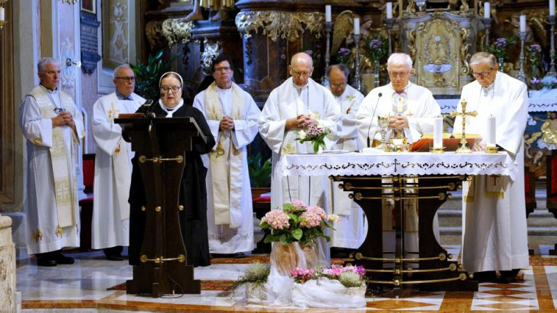 Nadškof Zore pa je v nadaljevanju pridige še posebej izpostavil, kako izjemno pomembno je geslo tokratnega Slomškovega dne. Vsem je postavil morda prvo ali zadnje vprašanje med vsemi: »Kdo je danes zame človek, ki sem mu včeraj verjel, in kdo sem danes jaz sam pred seboj?« Kot je nadškof poudaril, »posebno težavo to predstavlja mladim ljudem, ki še iščejo svojo notranjo podobo in se često prepirajo s svojo zunanjo podobo. Mladi ljudje, ki so neizmerno krhki, želijo potrditve, sprejetosti in predvsem ljubljenosti. Ki se sprašujejo, kdo sem, in istočasno čakajo in se morda obenem tudi bojijo odgovora, ki ga lahko slišijo iz besed in še bolj iz pogledov odraslih, različnih odraslih.« (Jože Potrpin, Ferlež Tjaša, Foto: Jože Potrpin)