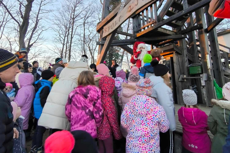 Otroci pa so po poti prejeli lučke za osvetlitev poti in hitro prispeli na cilj. Tam so se lahko pogreli ob odprtem ognju, se okrepčali z mafini in s toplim čajem ter prisluhnili pravljici. Posebno doživetje pa je zagotovo bilo, ko je Božiček z medvedkom v roki prav počasi prikorakal po stopnicah stolpa. Nagovoril jih je in po petju pesmi vse obdaril z darili. Nato je spet odkorakal nazaj proti vrhu stolpa. (Tjaša Ferlež)