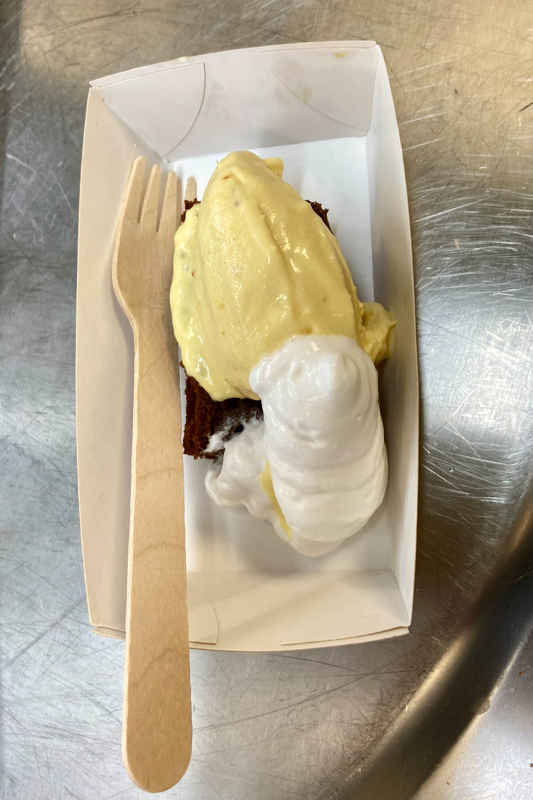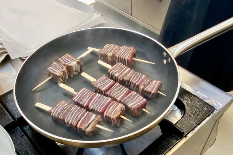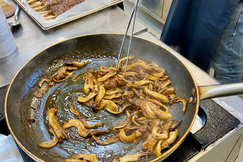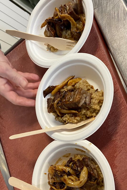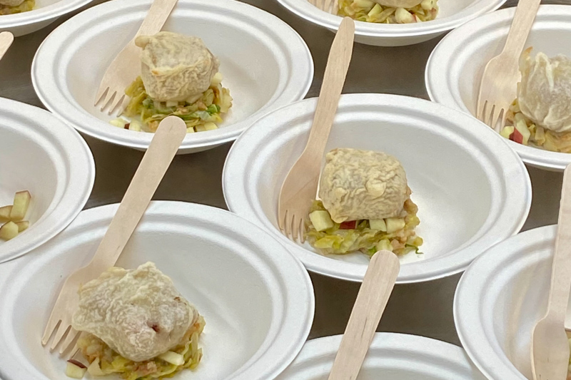 V tokratnem 8-hodnem meniju smo okusili naslednje jedi: pašteta s črnim orehom, hrustljava ocvrta tlačenka v tempuri, domači široki rezanci “Carbonara”, mini ješprenj z jurčki ter superhrana ostrigarji s kmetije Slapšak z bližnjega Padeža (gojenje in uporabo medicinskih gob smo v tem študijskem letu že spoznali na enem naših izobraževanj), zloženka pljučne pečenke in larda, za sladko slovo pa sočen brownie, domač ananasov sladoled in lahkotna kokosova pena.