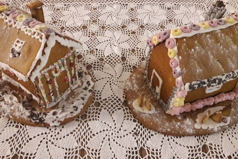 Sestavine za testo: Sestavine za glazuro: Dekoracija: barvni bomboni, mrvice, medvedki, kosmiči, lahko vse, kar najdemo v kuhinji V loncu zavremo med in vodo. Ohladimo. Obe vrsti moke, sodo bikarbono, limonino in pomarančno lupinico ter dišave za medenjake zmešamo v skledi ter dodamo hladni med. Oblikujemo testo, pokrijemo in postavimo v hladilnik, da se res dobro ohladi. Izrežemo želeno velikost hišic iz papirja, jih položimo na razvaljano testo in izrežemo. Ostanke izrezanega testa ponovno pregnetemo in razvaljamo v obliki velikega jajca, kar bo podloga za hišico. Napikamo z vilicami v vzorčku ali vrstah. Pečemo v ogreti pečici pri 200 stopinjah 15 minut. Ohladimo. Pripravimo glazuro iz vseh treh sestavin. Dele hiške zlepimo s pomočjo glazure. Okrasimo z bomboni, medvedki, mrvicami. Otroška domišljija nima meja! Pazite! Dekoracija lahko hitro zaide v otroška usta! Naši so ostali brez barvastih bombonov in so morali improvizirati pri dekoraciji. Medena hiška bo okras in ponos dela otrok ves praznični mesec. Postavimo jo na vidno mesto na kakšen lep prt.