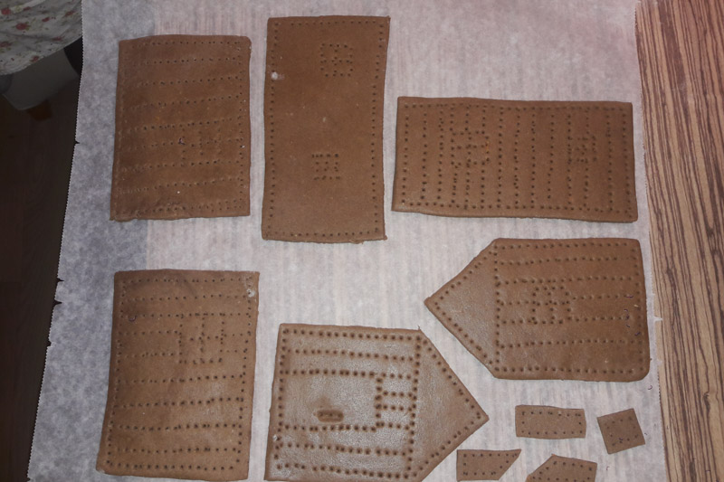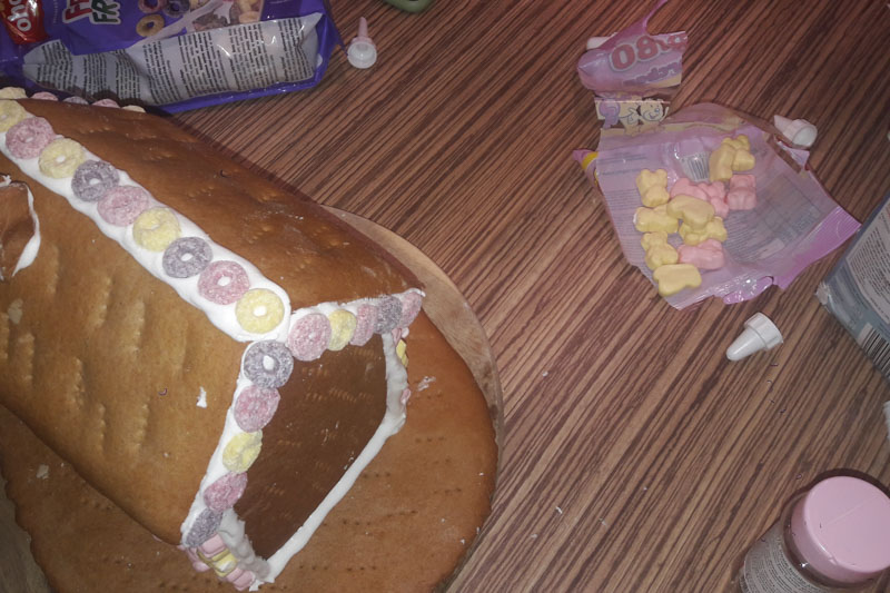 Sestavine za testo: Sestavine za glazuro: Dekoracija: barvni bomboni, mrvice, medvedki, kosmiči, lahko vse, kar najdemo v kuhinji V loncu zavremo med in vodo. Ohladimo. Obe vrsti moke, sodo bikarbono, limonino in pomarančno lupinico ter dišave za medenjake zmešamo v skledi ter dodamo hladni med. Oblikujemo testo, pokrijemo in postavimo v hladilnik, da se res dobro ohladi. Izrežemo želeno velikost hišic iz papirja, jih položimo na razvaljano testo in izrežemo. Ostanke izrezanega testa ponovno pregnetemo in razvaljamo v obliki velikega jajca, kar bo podloga za hišico. Napikamo z vilicami v vzorčku ali vrstah. Pečemo v ogreti pečici pri 200 stopinjah 15 minut. Ohladimo. Pripravimo glazuro iz vseh treh sestavin. Dele hiške zlepimo s pomočjo glazure. Okrasimo z bomboni, medvedki, mrvicami. Otroška domišljija nima meja! Pazite! Dekoracija lahko hitro zaide v otroška usta! Naši so ostali brez barvastih bombonov in so morali improvizirati pri dekoraciji. Medena hiška bo okras in ponos dela otrok ves praznični mesec. Postavimo jo na vidno mesto na kakšen lep prt.