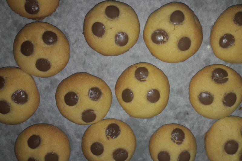 Iz sestavin v skledi zmešamo maso. Pečico ogrejemo na 190 stopinj. Na pekače, obložene s papirjem za peko, polagamo majhne kroglice, ki jim z ročajem kuhalnice naredimo luknjice. Zapolnimo jih z marmelado ali čokoladnimi kapljicami. Pečemo 12 minut in pustimo v pekaču, da se malo ohladijo, preden jih zložimo na krožnik.