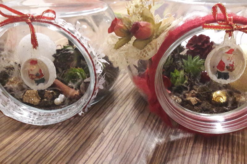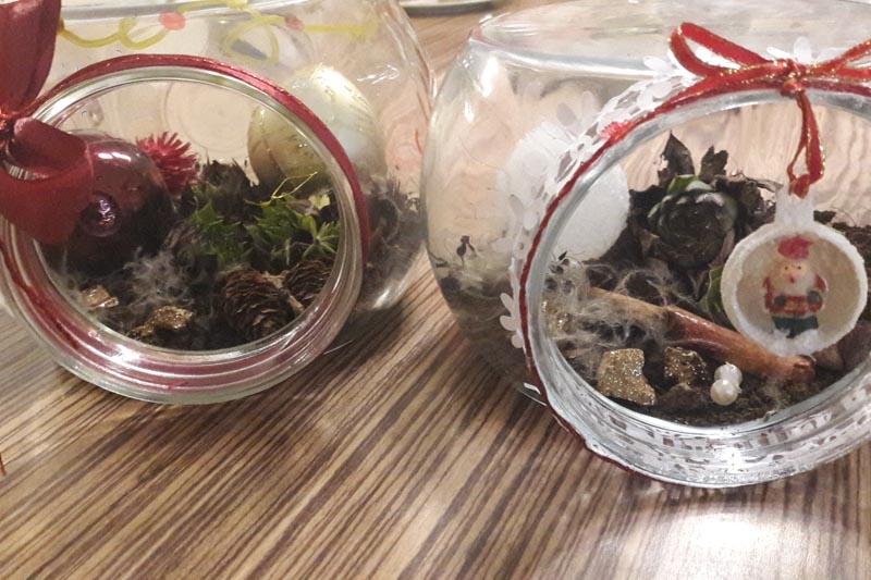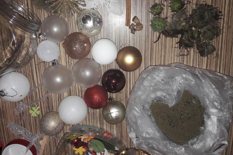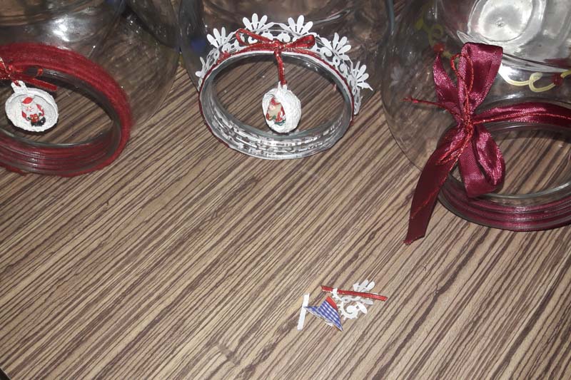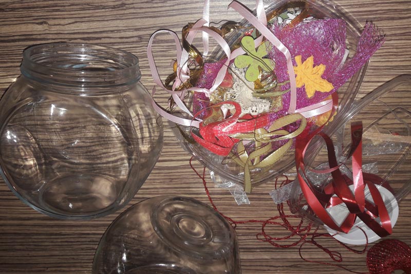 Pri pospravljanju predalov v kuhinji smo zagotovo naleteli na plastične ali steklene posodice, ki jih ne potrebujemo več. Mogoče jim manjkajo pokrovi. Nič hudega. Lahko jih uporabimo za dekoracijo. V predalu za dekoracijski material poiščimo trakove, razne ostanke, pentljice. Mogoče imamo v lončkih posajene kakšne kakteje. Pa kakšne okrasne bučke za jelko. Pustimo otrokom, da sami najdejo idejo, kako okrasiti posode. Zagotovo bodo nastale res lepe, unikatne dekoracije.
