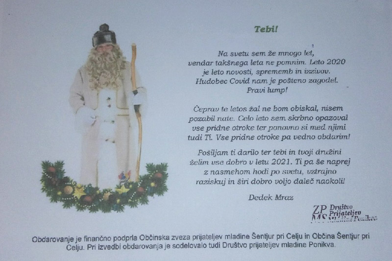 Društvo prijateljev mladine Šentjur je tudi letos razveselilo otroke po vsej občini Šentjur. Dedek Mraz je dolgo okleval in na koncu je sprejel pomembno odločitev. Letošnje leto je zagotovo spremenilo življenje vsem ljudem, ukrepi in omejitve so pot preprečile tudi Dedku Mrazu. Ker je že zelo star, se je letos spomnil nečesa, kar še nikoli ni naredil. Otrokom je darila poslal kar preko pošte.