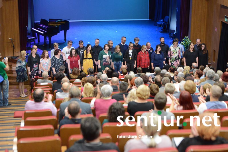 Šentjur, 13. 10. 2019 – “Obletnice spremljajo pomembne besede. Ena takih je poslanstvo, ki ga mora vedeti vodja izpostave, tudi če ga zbudiš sredi noči,” je uvodoma v brošuri zapisala vodja Javnega sklada RS za kulturne dejavnosti izpostave Šentjur Anita Koleša. Brošuro, ki so jo sicer obiskovalci slavnostne prireditve ob praznovanju 20-letnice sklada prejeli na koncu prireditve – da se ne bi dali preveč motiti in preštevati, koliko točk nastopajočih je še do konca nastopa. Prireditev so začeli s pravim šokom za obiskovalce – pevci Mešanega pevskega zbora Sonce iz Ponikve so pripravili pravi flash mob. Pevci zbora so vstajali kar iz sedišč IKC-ja, se postavili pred oder in zapeli dve pesmi.