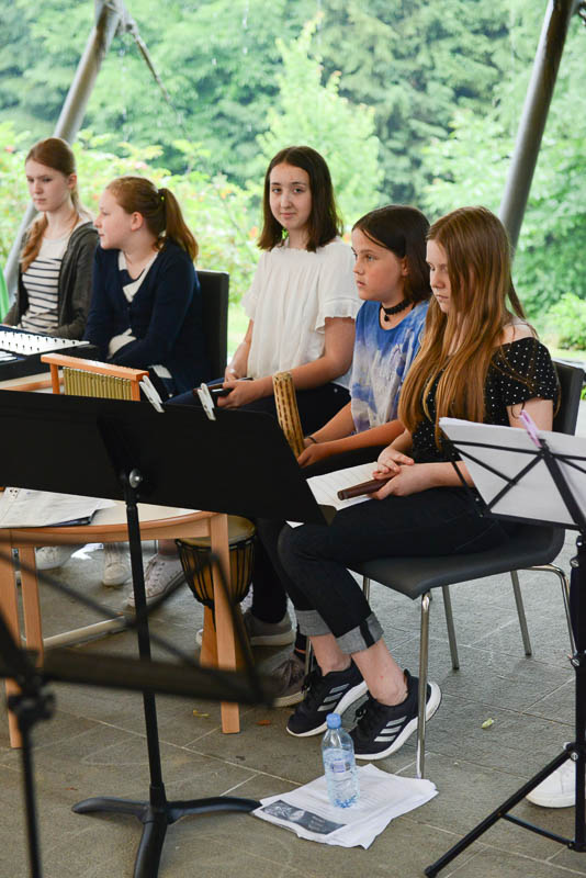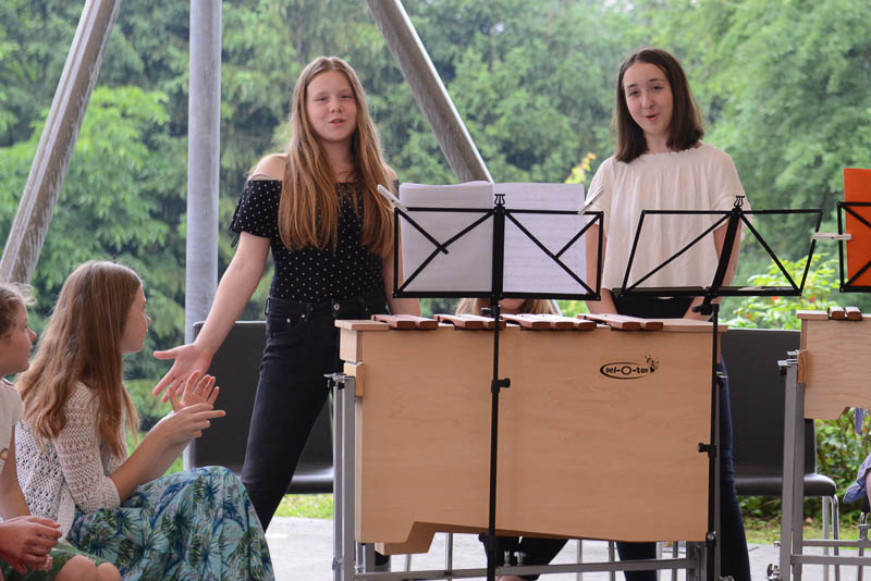 Ravno ti dve glasbeni zvrsti pa sta združili profesorici glasbe Tina Pečar in Diana Štih ter na simpatičnem koncertu na vrtu Ipavčeve hiše povezali Orffov orkester s kvartetom pevk in trio flavtistk Evterpa. “Z zadostnim številom Orffovih instrumentov lahko zaigramo vsako skladbo,” je povedala Pečarjeva, ki je naredila kar nekaj priredb modernejših popevk, kot so To mi je všeč (Nina Pušlar), Perfect (Ed Sheeran), Ne bodi kot drugi (Ditka) itd.