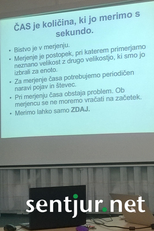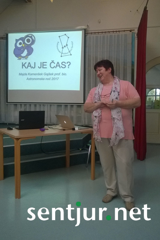 Prireditev, ki spada v sklop Šentjurskega poletja, je zopet pritegnila veliko število ljudi. Najprej so se zbrali v večnamenskem prostoru tamkajšnje šole in prisluhnili strokovnemu predavanju, ki so ga naslovili Merjenje časa nekoč in danes. Po uvodnem pozdravu predsednice domačih kulturnikov Dragice Vračun Hercog in predsednice Koscev Marice Kamplet je sledilo predavanje Majde Kamenšek Gajšek, ki je obiskovalce popeljala v sliki in besedi skozi zgodovino merjenja časa. Predstavila je različne naprave za merjenje časa, vse od kamnitih stavb v naravi, usmerjenih v določene strani neba, do najsodobnejših, ki jih uporabljamo danes. Spregovorila je tudi o pomenu merjenju časa skozi zgodovino, tovrstnih problemih in biološki uri. Na platnu so si obiskovalci lahko pogledali tudi vrste merilnih instrumentov skozi zgodovino.
