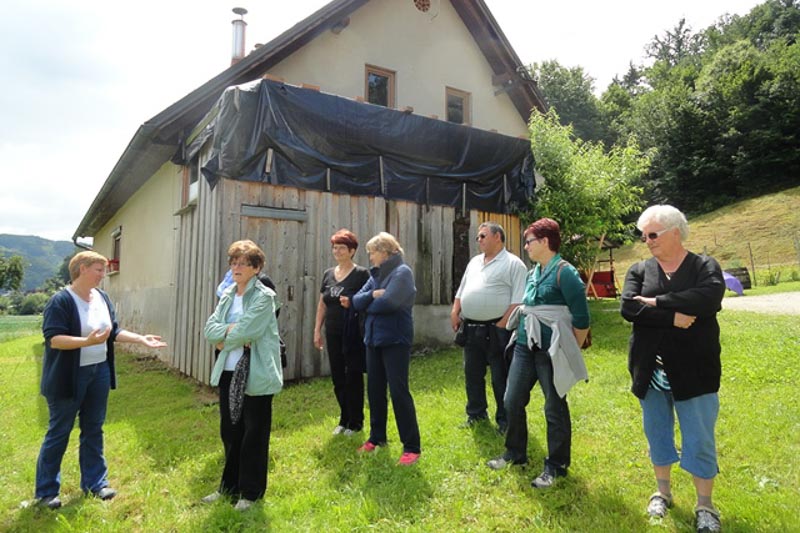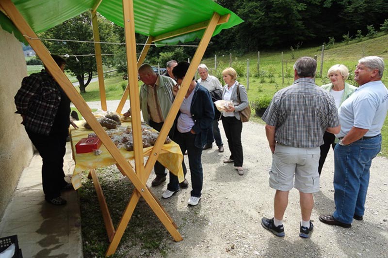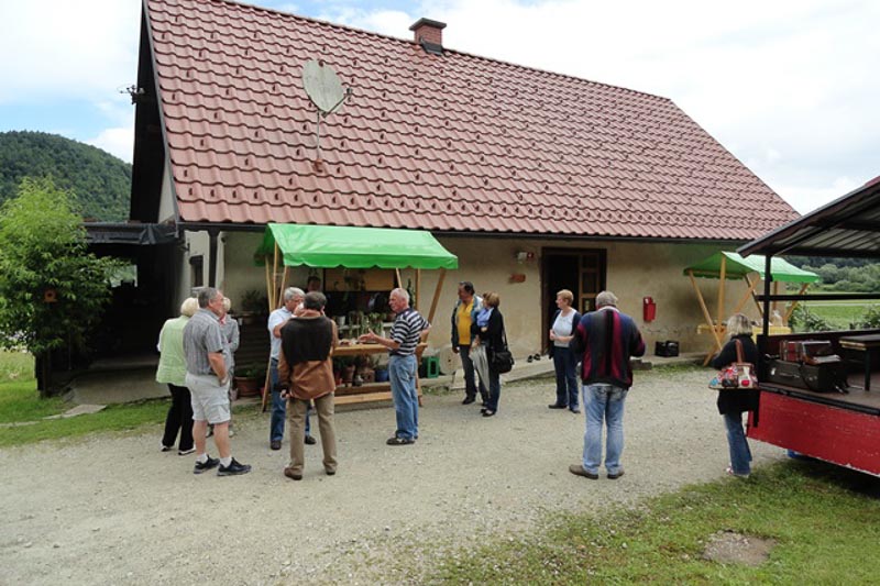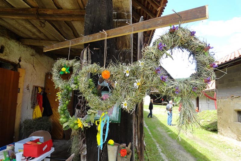 Vezovje, 24. 6. 2015 – V sredo je v okviru Tedna vseživljenjskega učenja Ljudska univerza Šentjur organizirala Dan odprtih vrat kmetije Ploštajner v Vezovju pri Šentjurju. Kljub začetnemu slabšemu vremenu je bilo na kmetiji zelo živahno. Za obiskovalce je bilo dobro poskrbljeno. Pričakali so jih z domačim zeliščnim čajem, vinom, žganjem iz suhih sliv, s pecivom in kruhom, namazanim s svinjsko mastjo ter z ocvirki. Rosanda Ploštajner je nato goste popeljala po kmetiji. Ogledali so si kokošnjak, hlev ter občudovali konje, zajčke in ostale domače živali. Prikazali so tudi mletje koruze v moko ter oblikovanje venčkov najrazličnejših oblik iz slame, travniških cvetlic in rožic iz krep papirja. Po končani predstavitvi je bil na voljo tudi nakup sladkih in slanih dobrot, marmelad, vse vrst rezancev in kaš. Ko je posijalo sonce, sta za dobro voljo poskrbela še muzikanta, saj so se obiskovalci lahko zavrteli ob zvokih domače glasbe. Dan se je odvijal v sproščenem in prijetnem vzdušju ter pogovorom starih znancev ob kozarčku vina. (S. T.)