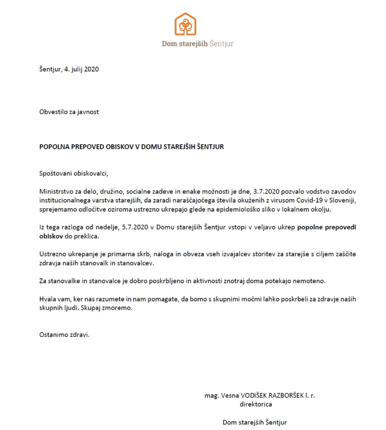To je sicer skupno že petnajsta okužba z virusom Covid-19 na območju Občine Šentjur od začetka testiranj. Zaradi naraščajočega števila novookuženih v Sloveniji bo od nedelje, 5. julija 2020, v Domu starejših Šentjur veljala popolna prepoved obiskov. Informacije o virusu in preventivi najdete na spletni strani NIJZ.