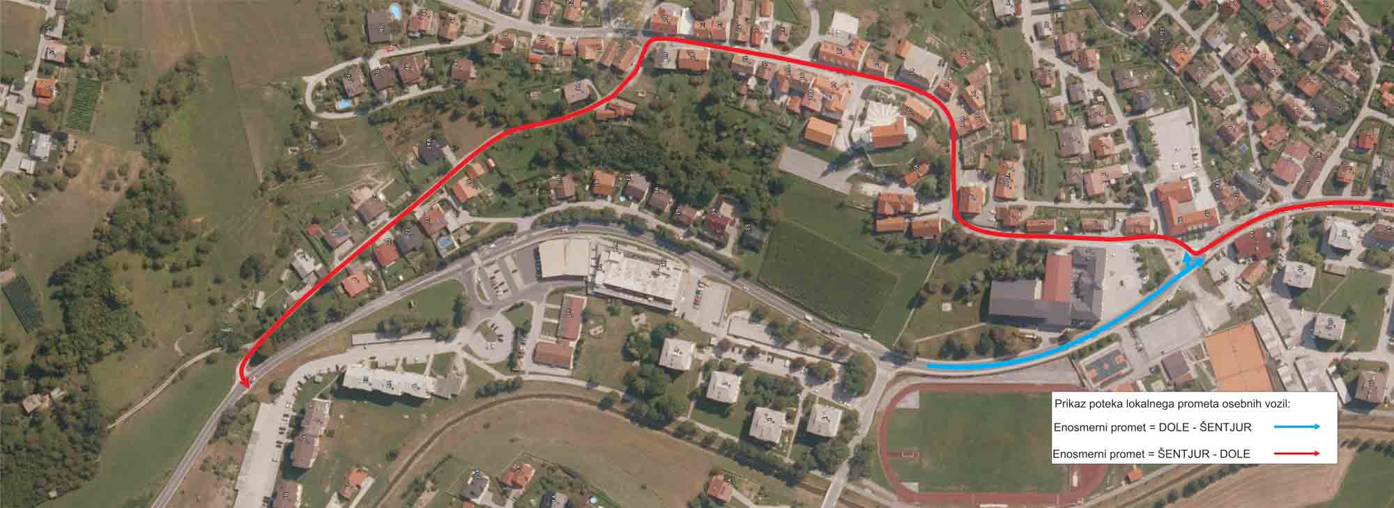 Lokalni promet osebnih vozil bo potekal iz smeri Dol v smeri Šentjurja enosmerno skozi gradbišče. Iz smeri Šentjurja v smeri Dol pa po Ulici skladateljev Ipavcev, Pod Rebrami, ker se bodo vozila vključila nazaj na regionalno cesto. Tranzitni promet skozi zaporo ne bo dovoljen. Obvoz za tovorna vozila bo potekal na izvozu iz avtoceste Celje – center, v nadaljevanju po Mariborski cesti do križišča pri vojašnici in levo po glavni cesti G2 107 Celje–Štore–Šentjur in obratno. Za osebna vozila je obvoz na relaciji krožišče Dole proti Proseniškemu, v Bukovžlaku levo proti Slancam in nato po cesti G2 107 do Šentjurja.