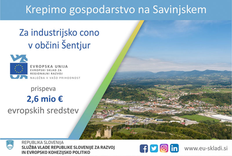 Šentjur, 4. 5. 2021 – Občina Šentjur je za izvedbo projekta Komunalno urejanje industrijske cone Šentjur jug – 3 uspešno pridobila sredstva Evropskega sklada za regionalni razvoj. S strani Službe Vlade Republike Slovenije za razvoj in evropsko kohezijsko politiko je bilo za sofinanciranje projekta, ki ga bo Občina Šentjur izvajala v okviru Dogovora za razvoj Savinjske razvojne regije, odobrenih dobrih 2,6 milijona evrov. Dodatnih 880.000 evrov upravičenih stroškov bo zagotovljenih iz državnega proračuna, s strani Ministrstva za gospodarski razvoj in tehnologijo. Vrednost celotnega projekta znaša 3,9 milijona evrov.