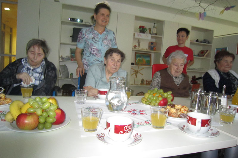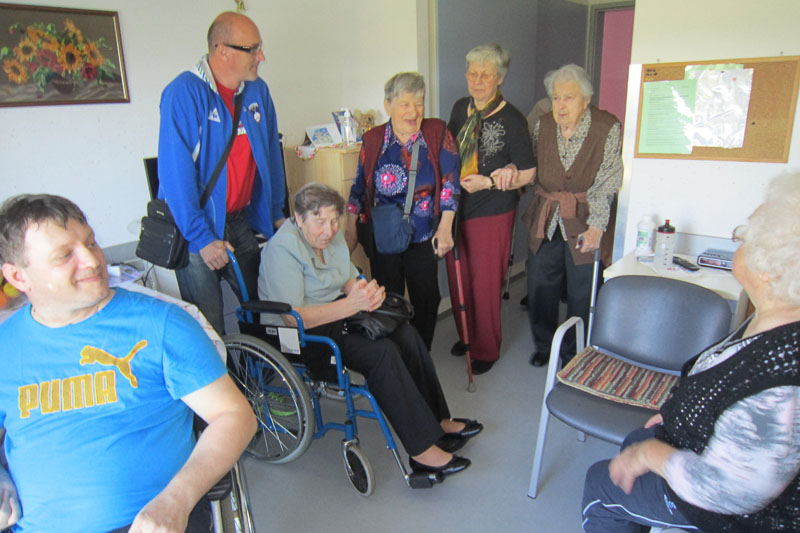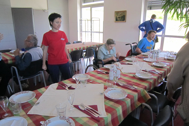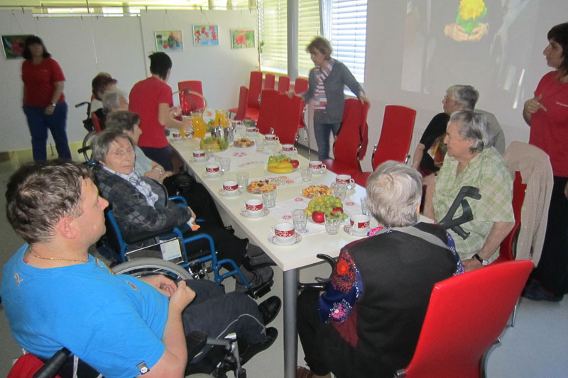 Ko smo se po nekajminutnem iskanju vendarle znašli na dovozu v dom, nas je tam pričakalo veliko število stanovalcev in osebja. Pravkar so zaključili z zasajanjem balkonskega cvetja, na eni od teras pa je bila skupina stanovalcev, ki jih je obiskala članica Tačk pomagačk s svojim štirinožnim prijateljem, kosmatim terapevtom, kot mu pravim. Vsak od nas je dobil svojega spremljevalca, ki nas je pospremil v notranjost doma, kjer so nas povabili k okrepčilu. S fotografijami in z nekaj posnetki so nam predstavili široko paleto različnih dejavnosti, ki jih ponujajo stanovalcem. Izmenjali smo izkušnje in malo poklepetali o stanju zapolnjenosti v domovih. Razdelili smo se v dve skupini in vsako je po svoji strani popeljala skupina zaposlenih na ogled doma. Seveda smo bili navdušeni nad velikostjo prostorov in komoditeto stanovalcev, ki jo ponuja funkcionalna razporeditev tako skupnih prostorov kot posameznih sob v domu Idila. Sledilo je obilno in izredno okusno kosilo, ob katerem smo zopet neumorno klepetali in primerjali razmere v Idili in Šentjurju.