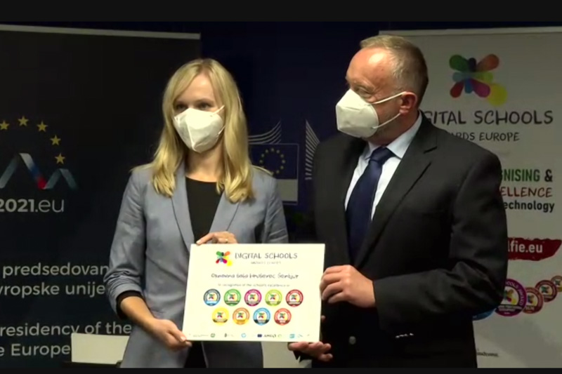 Ljubljana, 5. 10. 2021 – Na dan učiteljev je v Ljubljani, na Predstavništvu Evopske komisije v Sloveniji, na otvoritvenem dogodku »Uradna predstavitev orodja SELFIEforTEACHERS za samo-refleksijo«, Osnovna šola Hruševec Šentjur kot ena izmed prvih petih šol v Sloveniji na slovesni prireditvi prejela »priznanje digitalna šola«.