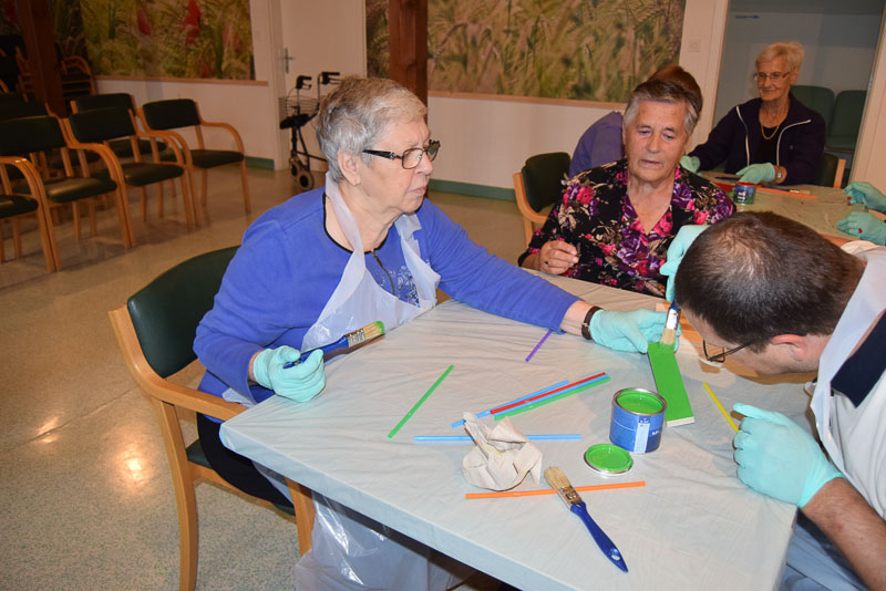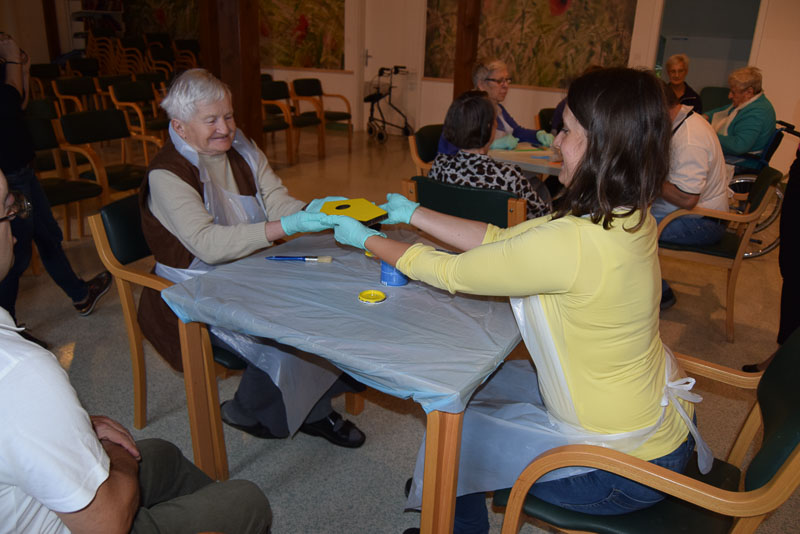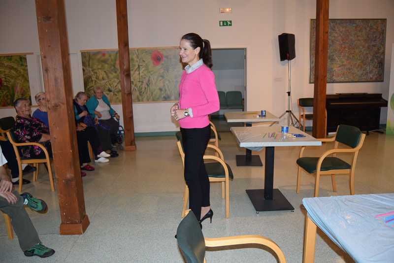 Šentjur, 25. 10. 2016 – Prvi oktober je svetovni dan starejših. V Domu starejših Šentjur ta praznik običajno obeležijo s tradicionalnim srečanjem s svojci in dnevom odprtih vrat, ki ga poimenujejo Sonce v jeseni. Ker so se pred dnevi lotili prenove osrednjega dela hiše, tega srečanja v taki obliki ni bilo mogoče organizirati. Ko bodo dela končali, bodo na srečanje povabili svojce, praznik pa so praznovali na malo drugačen način. Pred časom so dobili v dar sestavne dele za leseno ptičjo hišico in odločili so se, da jo bodo pobarvali na posebnem dogodku. K sodelovanju so povabili varovance Varstveno delovnega centra Šentjur, z katerim zgledno sodelujejo na različnih prireditvah in aktivnostih že vrsto let in so se dogodka z veseljem udeležili.