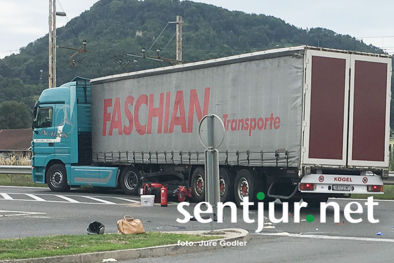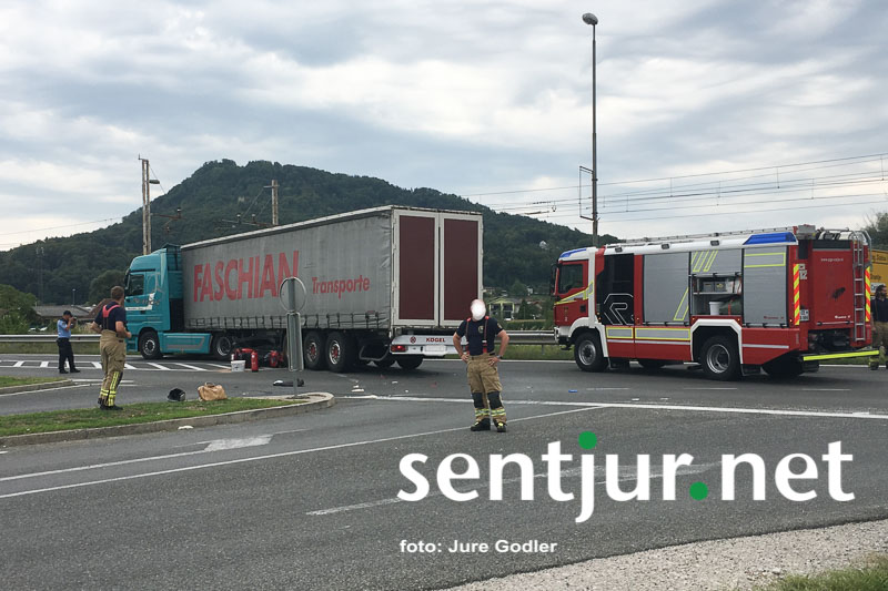 Šentjur, 19. 7. 2017 – Na križišču pri Lidlu se je ponovno zgodila huda prometna nesreča. 27-letni voznik tovornega vozila je vozil iz smeri industrijske cone Anderburg proti glavni cesti. Ko je pripeljal do križišča Drofenikove ulice je skušal zaviti na glavno cesto v smeri Šmarja pri Jelšah in izsilil prednost 76-letnemu vozniku motornega kolesa, ki je v tistem trenutku pripeljal po prednostni cesti. Voznik motornega kolesa je trčil v levi bočni del priklopnega vozila. V trčenju se je hudo poškodoval. Posredovali so gasilci PGE Celje, vozilo nujne medicinske pomoči pa je poškodovanega odpeljalo na oskrbo v Bolnišnico Celje. Križišče pri Lidlu počasi postaja osrednja črna prometna točka na Šentjurskem.