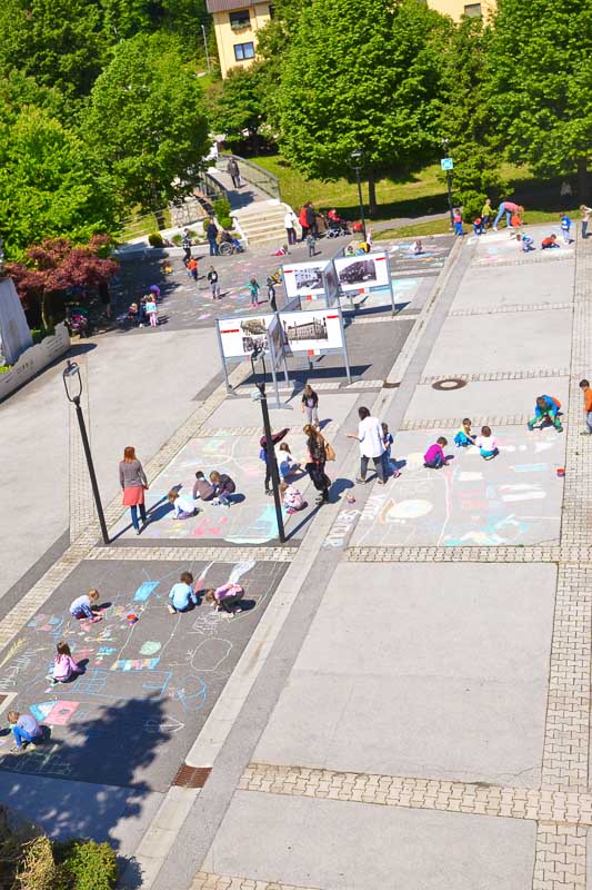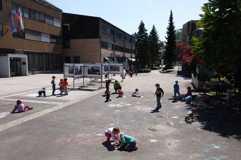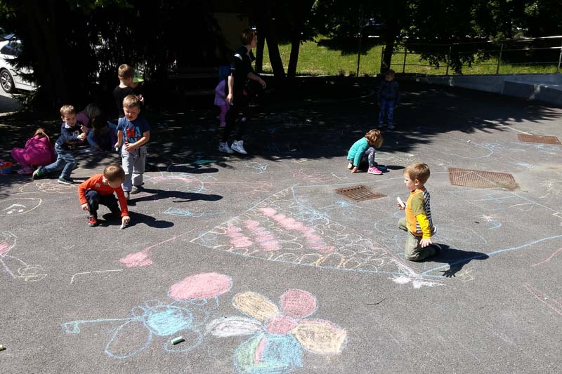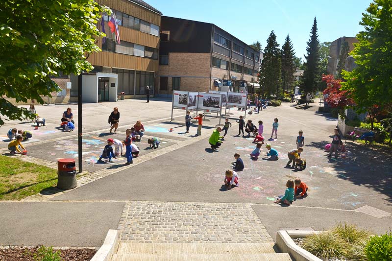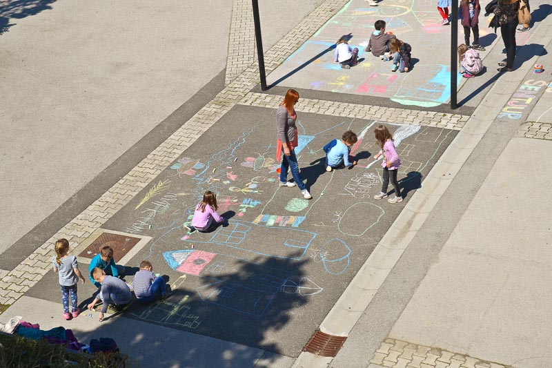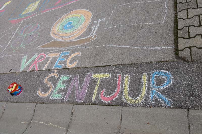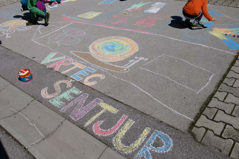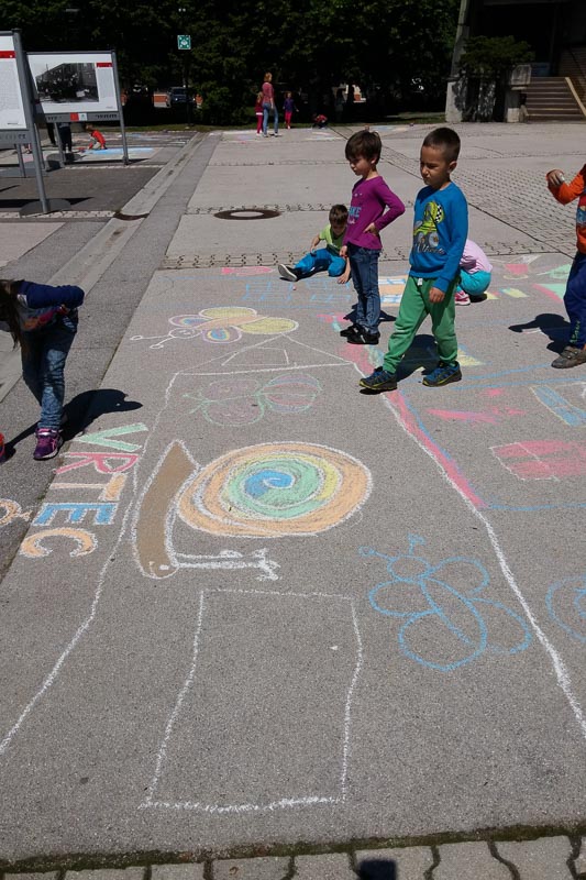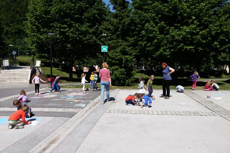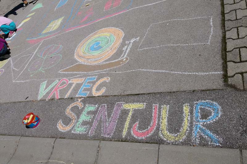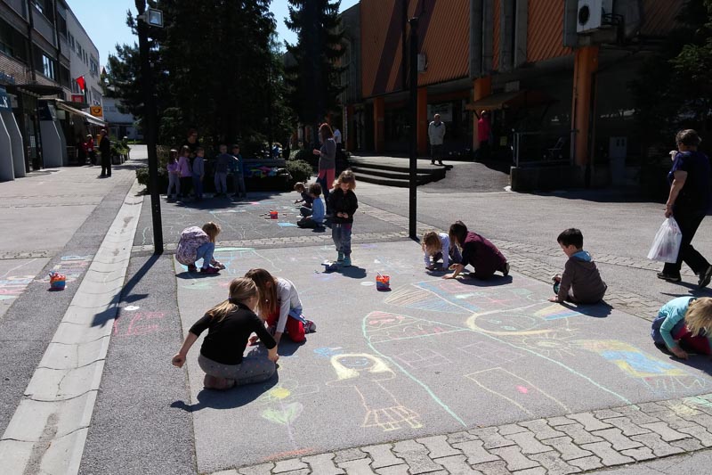 Šentjur, 18. 5. 2016 – Otroci iz Vrtca Šentjur so se v Tednu ljubiteljske kulture odločili, da poživijo asfaltno sivino pred občinsko stavbo. Otroci, ki obiskujejo enoto Center, so s kredami skušali upodobiti temo mesto in cvetje, kar jim je odlično uspevalo. Mladi umetniki, stari od 4 do 6 let, so narisali hiše, drevesa, igrala, bloke in tako na svoj edinstven način upodobili mestni vrvež. Poslikava Mestnega trga je bila le ena izmed aktivnosti Vrtca Šentjur v Tednu ljubiteljske kulture, katere projektu je vrtec resno pristopil. Saj so v tem tednu, posvečenem kulturi, vsak dan namenili eno dejavnost. (Jure Godler)