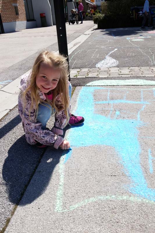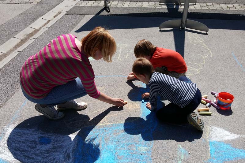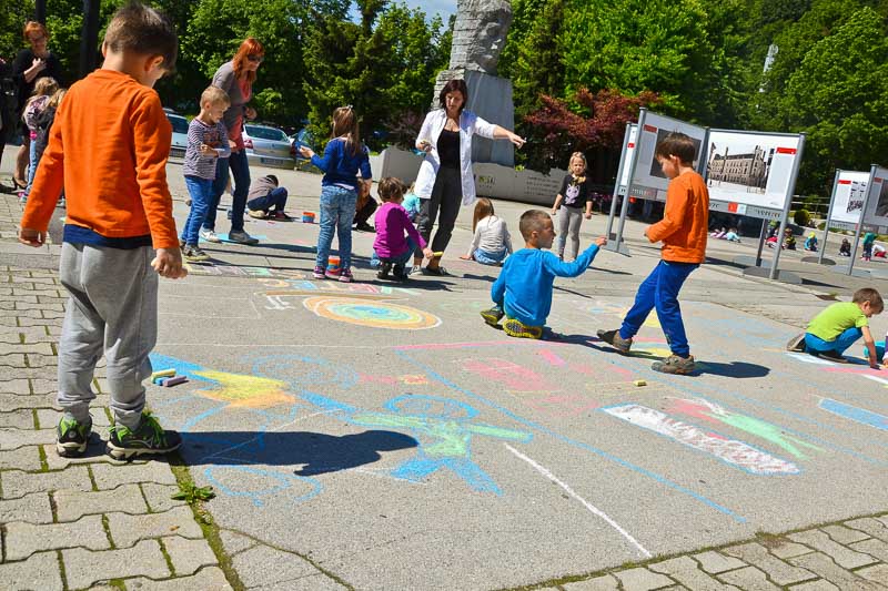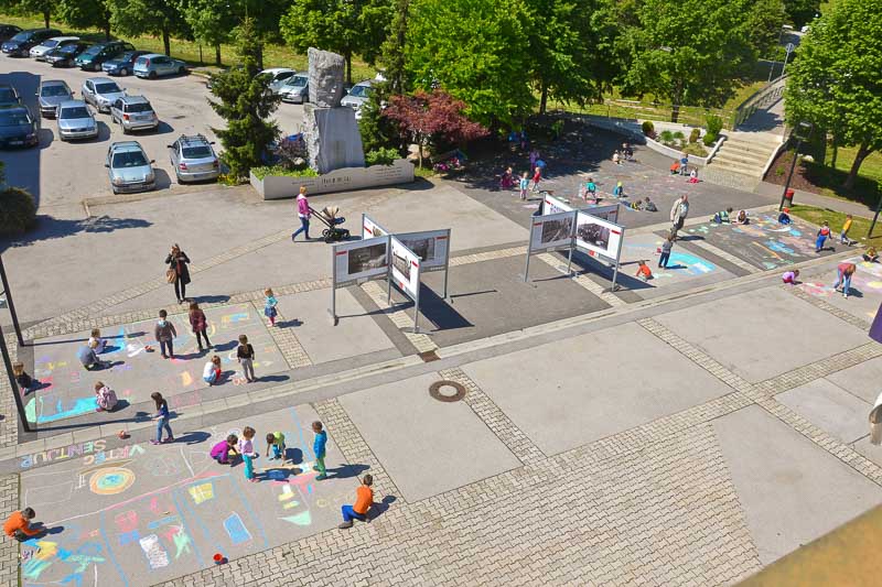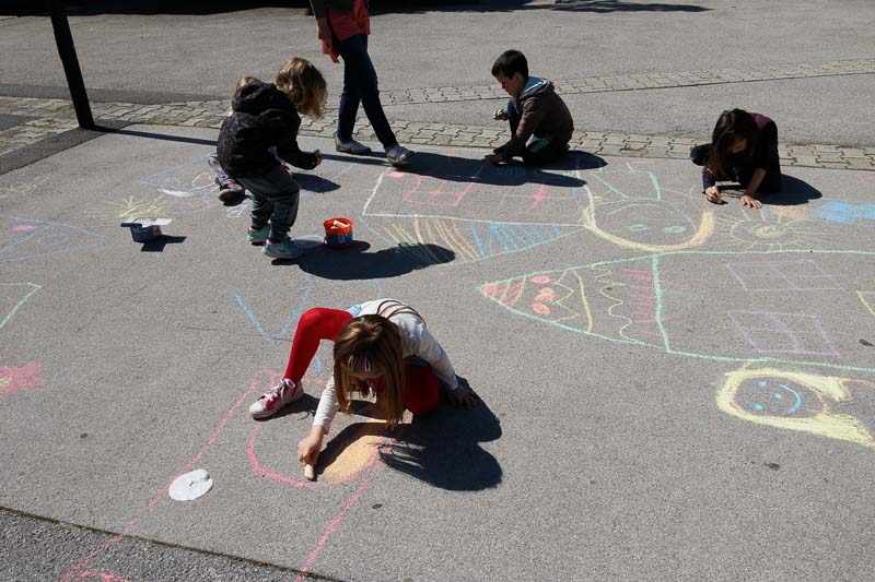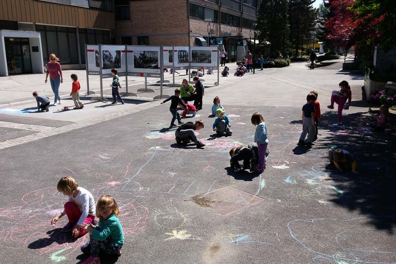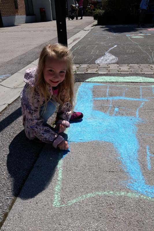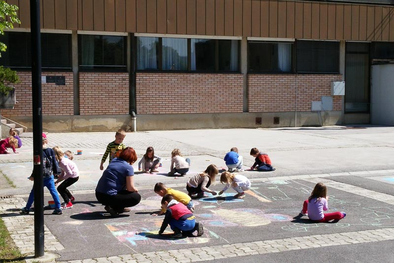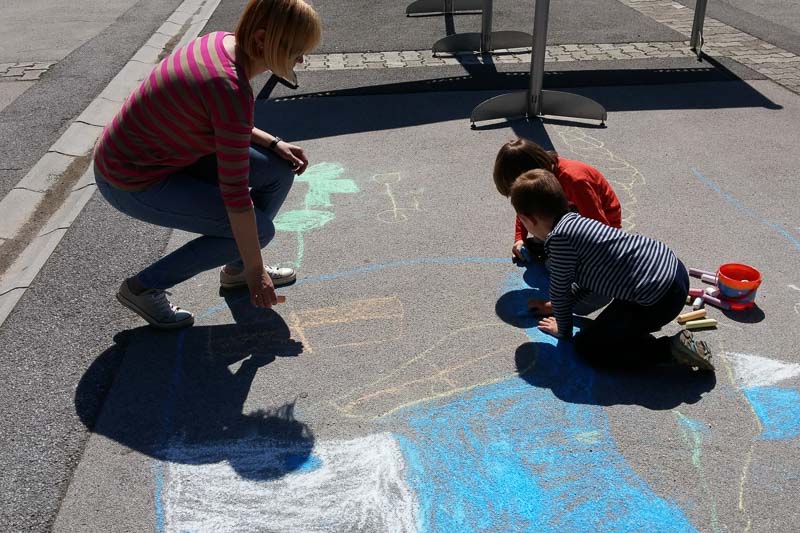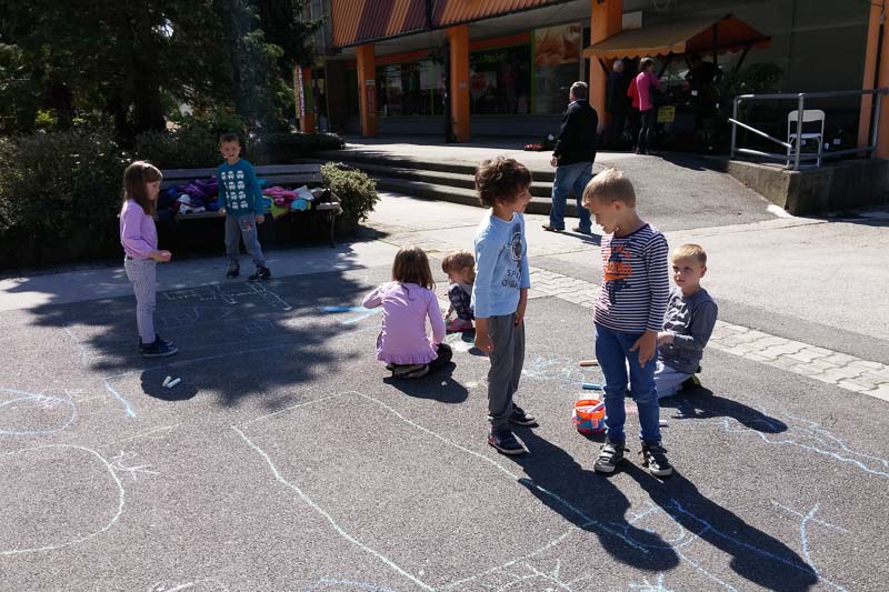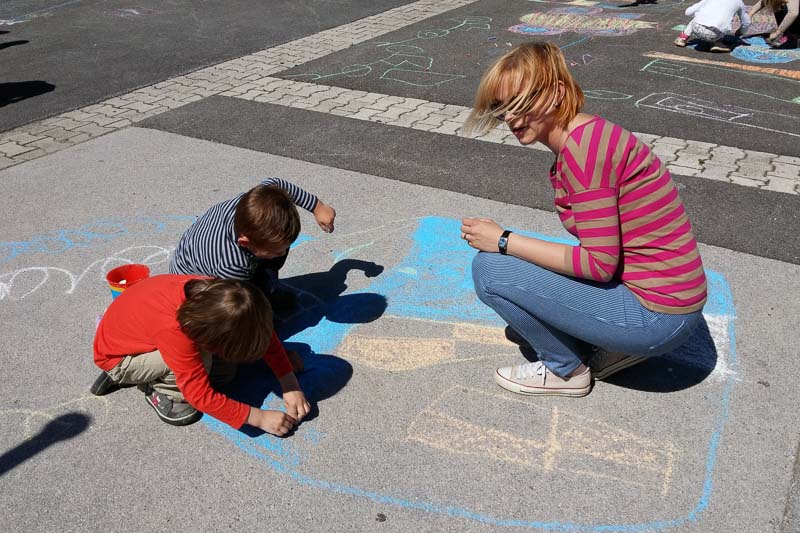 Šentjur, 18. 5. 2016 – Otroci iz Vrtca Šentjur so se v Tednu ljubiteljske kulture odločili, da poživijo asfaltno sivino pred občinsko stavbo. Otroci, ki obiskujejo enoto Center, so s kredami skušali upodobiti temo mesto in cvetje, kar jim je odlično uspevalo. Mladi umetniki, stari od 4 do 6 let, so narisali hiše, drevesa, igrala, bloke in tako na svoj edinstven način upodobili mestni vrvež. Poslikava Mestnega trga je bila le ena izmed aktivnosti Vrtca Šentjur v Tednu ljubiteljske kulture, katere projektu je vrtec resno pristopil. Saj so v tem tednu, posvečenem kulturi, vsak dan namenili eno dejavnost. (Jure Godler)
