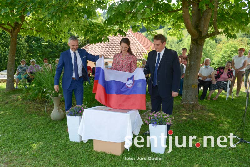 Sledil je še sklepni dogodek, kjer so direktorica Doma starejših Šentjur, župan in minister, slavnostno odgrnili slovensko zastavo s temeljnega kamna in tako tudi uradno otvorili začetek nove in za dom starejših zelo pomembne investicije. (Jure Godler)