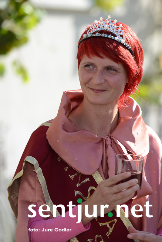 Šentjur, 10. 10. 2014 – Modri kavčini, potomki mariborske najstarejše trte, kot kaže, prostor pred Ipavčevo hišo v Šentjurju zelo ustreza, nekaj pa prispeva tudi mestni viničar Jurij Malovrh z ekipo. Dokaj pozna trgatev modrinke je v Zgornji trg privabila nekaj vinogradnikov in ostalih občanov. Voditeljica protokola Polonca Mastnak je pohvalila vedno lepši izgled starega Zgornjega trga, kamor se bo v celostno obnovljeno podobo kmalu pridružila Ipavčeva 30, kjer bo dobila prepotrebne prostore šentjurska glasbena šola. Gospodar trte, župan mag. Marko Diaci, je povedal, da je trta obrodila bistveno manj kot lansko leto, za kar je krivo tudi letošnje vreme. Trte letos niso “sprešali”, ampak kar “pozobali”. Skrbnik trte – mestni viničar – je simbolično tudi izmeril vsebnost sladkorja, ki je bila presenetljivo visoka.