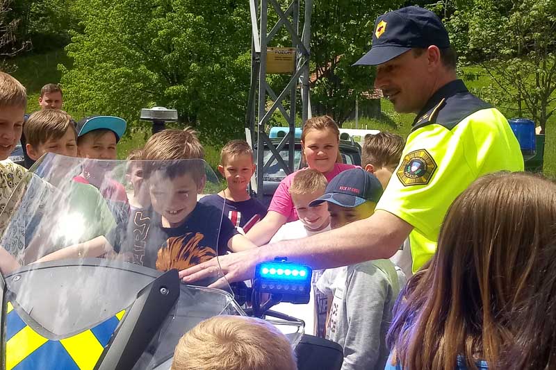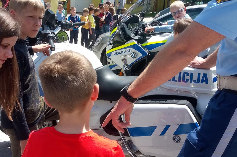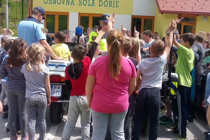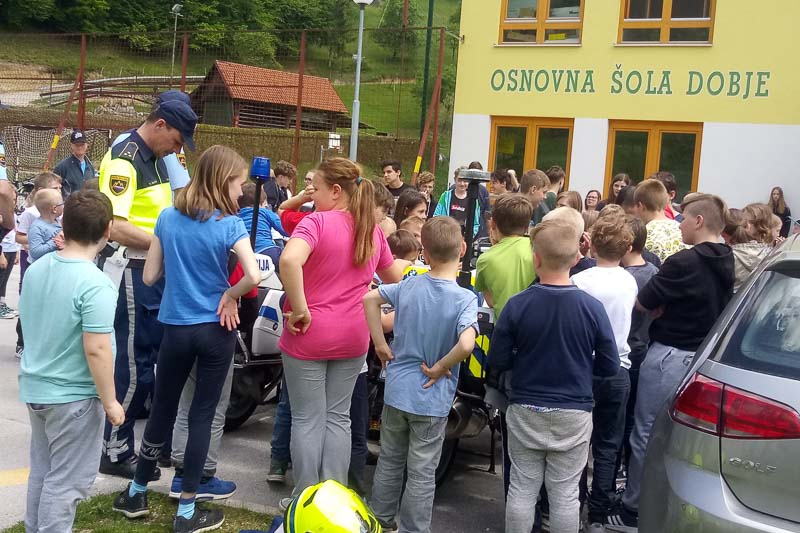 Dobje, 14. 5. 2019 – Motoristi spadajo med bolj ogrožene skupine udeležencev, ki so pogosto žrtve prometnih nesreč. Ker je Svet za preventivo in varnost v cestnem prometu (SPV) Občine Dobje zaznal, da je o varnosti na motorju potrebno spregovoriti tudi med populacijo, ki se z motornimi vozili že vključuje v promet. Največkrat se ti vključujejo v promet s pomanjkljivimi izkušnjami, opremo in znanjem zato so na Osnovni šoli Dobje pripravili predavanje o varnosti na motorju. Predavanje je bilo terensko, osnovnošolci so se zbrali na igrišču, kamor sta se pripeljala dva policista na motorju Uroš Klanjšek iz PP Celje in Vinko Mlakar iz PPP Celje, ob prisotnosti Petra Užmaha, vodje policijskega okoliša Policijske postaje Šentjur.