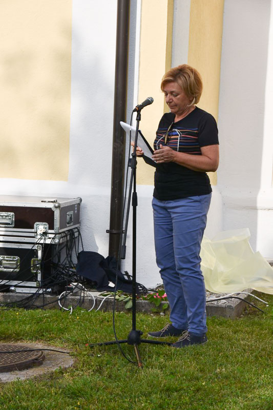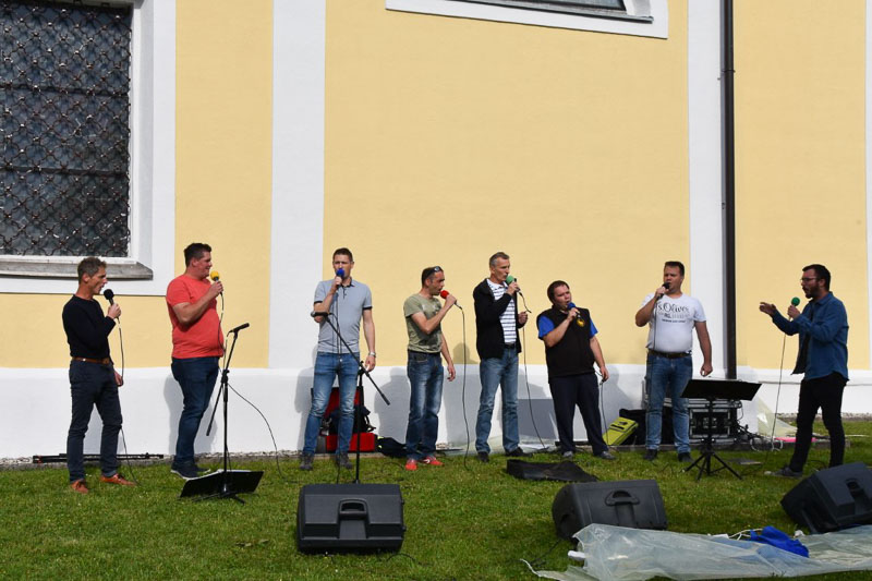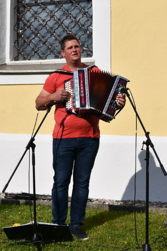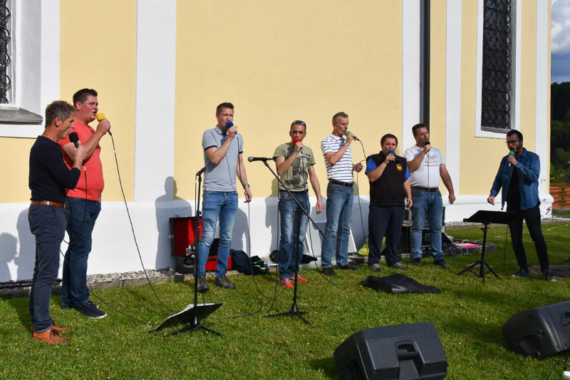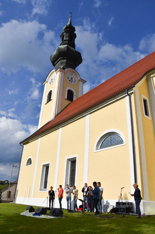 V zapetem programu pa so zadonele tudi Oj, Triglav, moj dom, Ko boš prišla na Bled, Slakova Deželica sonca in grozdja, ki jo je popestril Jure Zdolšek na diatonični harmoniki in druge. Zaključili pa so kot pravi “lokal patrioti” s pesmijo, ki so jo nekoč prepevali New Swing Quartet – Šentjurčani, katero priredbo za Vokalno skupino 7 de’ci je napisal kar njihov umetniški vodja Leon Ašenberger. Čeprav njihovega nastopa niso nagrajevali alpavzi iz neposredne bližine, pa so se ti le slišali v daljavi. Pevci se tudi zahvaljujejo domačemu župniku Vinku Čonču, ki jim je koncert tudi omogočil. Naslednji teden pa bodo prav tako s cerkvenega obzidja zadoneli posnetki šentjurskih instrumentalistov, če jim bo vreme naklonjeno. (Jure Godler, foto: Anton Kukovič)