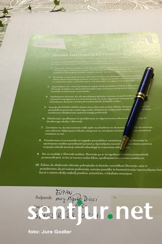 Občina Šentjur se je pridružila ostalim točkam v Sloveniji, ki sodelujejo na drugem nacionalnem pozivu Slovenske turistične organizacije za pospeševanje in presojo trajnostnega poslovanja v turizmu, imenovanega Zelena shema slovenskega turizma ali Slovenia Green, zato je tokratno delovno srečanje bilo usmerjeno v tematiko Zelenega turizma. Ob tej priložnosti je župan mag. Marko Diaci podpisal zeleno politiko oz. vstop v zeleno shemo. Jana Apih, direktorica tovarne trajnostnega razvoja je predstavila koncept sheme in koristi, ki jih prinaša znak Slovenia Green za lokalno okolje kot tudi za obiskovalce.
