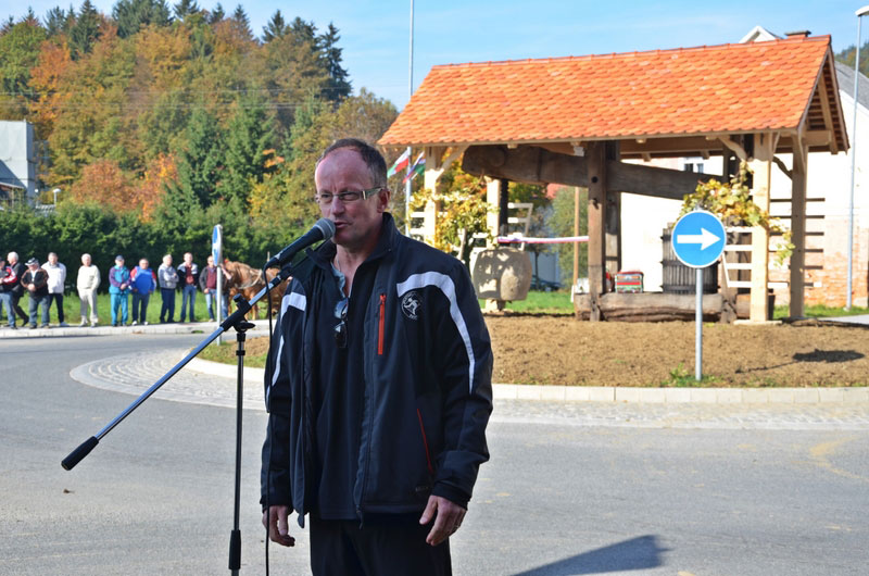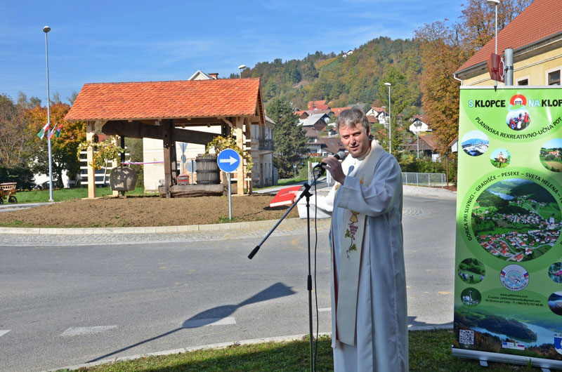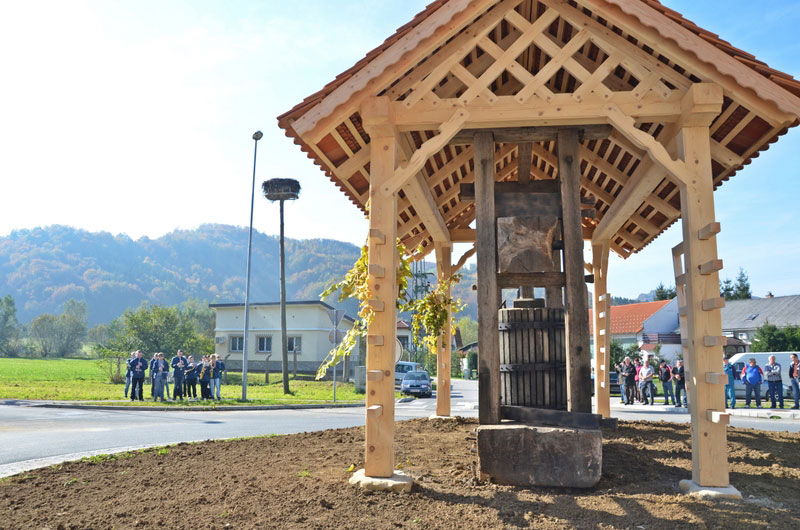 Prešo so zavarovali tudi s kozolcem, da se zavaruje pred raznimi vremenskimi vplivi. Na krožišču imajo namen še zasaditi vinsko trto. Ker se pri taki stvari spodobi, da se pred svečanim dogodkom naredi še blagoslov in žegnanje, so za to poprosili domačega župnika Marka Šramla. Vsak, ki se bo tod mimo peljal, mu bo pogled na prešo dal vedeti, da se nahaja v vinorodnem kraju. Ta preša bo tudi vabilo na praznovanje Sv. Martina, ki ga bodo letos že šestič praznovali 10. novembra skupaj s fanti s Praprotna. Za konec še najbolj pomemben podatek o tej skulpturi, in sicer, da je preša ovrednotena na okoli 6.000 EUR. Martin Ozis je podaril prešo in organizacijska dela. Jože Pustivšek je priskrbel celoten les za kozolec. Klemen Brglez in Nataša Veršič sta izdelala kozolec. Rosanda Plauštajner in Jože Plahuta sta podarila kritino, Marko Novak prevoz ter stokovno delo pri postavitvi kozolca in preše je sodeloval še Jože Stojan. Lojze Vodeb je bil mojster pri pokrivanju strehe, pomagalo je še veliko prostovoljcev. Za glasbeno spremljavo pa je poskrbel del pihalnega orkestra Šentjur. (V. A.)