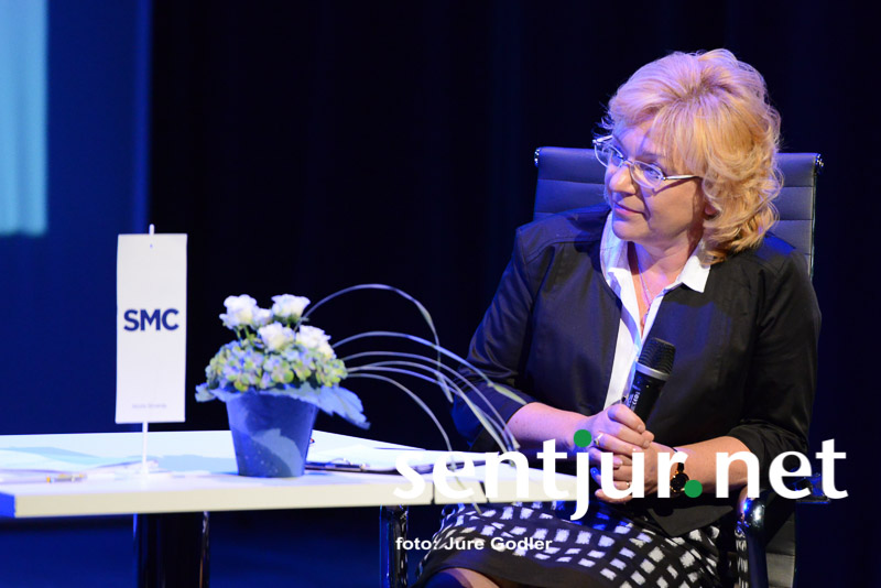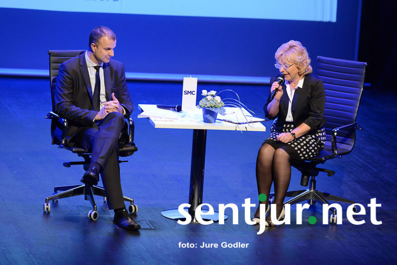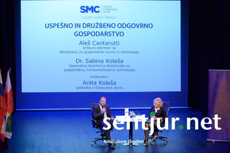 Šentjur, 25. 5. 2015 – Lokalni odbor Stranke modernega centra (SMC), je v goste v šentjurski IKC povabil ministra za gospodarski razvoj in tehnologijo Zdravka Počivalška. Manj kot sto poslovnežev in simpatizerjev stranke ga žal v IKC ni dočakalo, saj je minister moral odpotovati na službeno pot, sporočilo o tem pa so v LO SMC prejeli šele v soboto. Vseeno niso preklicali srečanja, namesto ministra pa se je povabilu odzval Aleš Cantarutti, državni sekretar na zgoraj omenjenem ministrstvu. Na srečanju pa je v manjšem delu sodelovala tudi dr. Sabina Koleša, generalna direktorica Direktorata za podjetništvo, konkurenčnost in tehnologijo. Pogovor z državnim sekretarjem pa je vodila šentjurska državnozborska poslanka Anita Koleša. Organizatorji so, da so zapolnili manjko ministra, ki je naslednji dan, ko obiskal košarkarsko tekmo v Rogaški Slatini, predvajali le zvočni posnetek z njim.