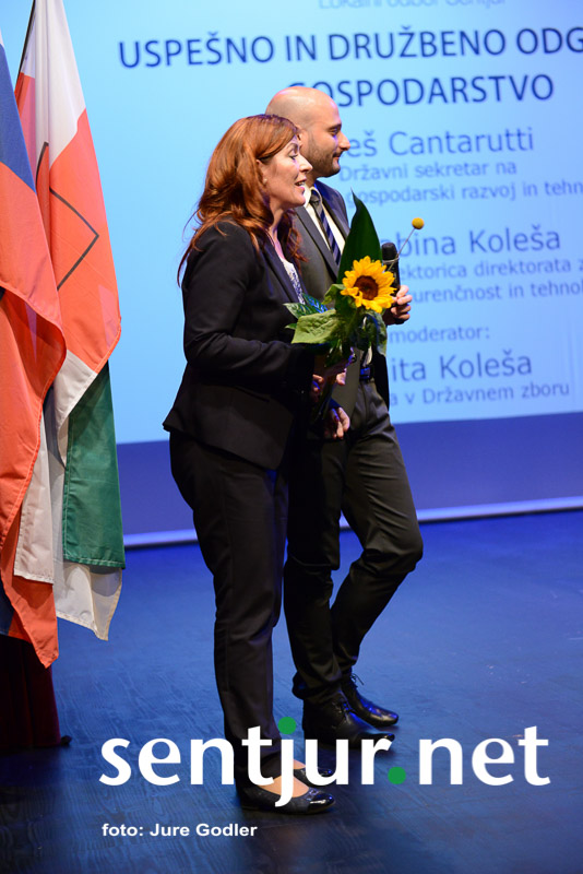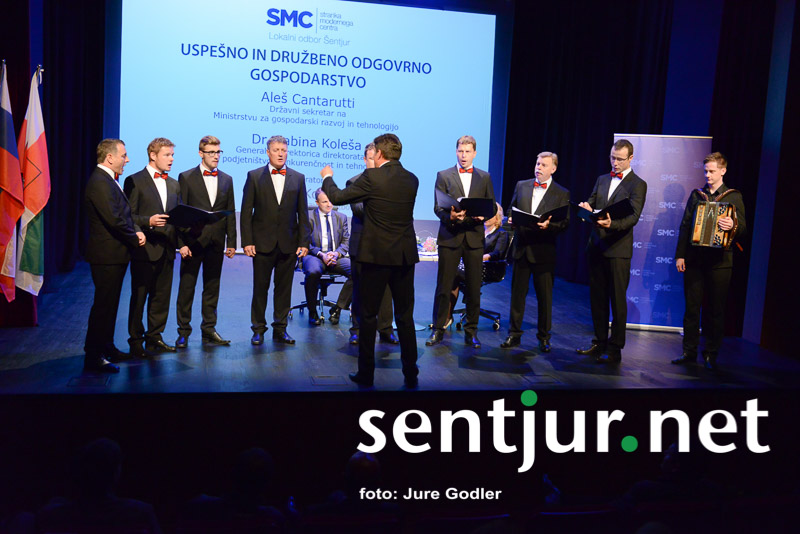 Sekretar Aleš Cantarutti je obljubil, da bo odgovore na vprašanja, ki niso bila direktno vezna na gospodarsko ministrstvo posredoval drugim ministrstvom in odgovore nazaj k lokalnemu odboru SMC. Za obisk se mu je zahvalil predsednik LO SMC Peter Jevšinek in mu podaril košaro šentjurskih dobrot. Pred neformalni pogovorom s sekretarjem v avli IKC pa so zapeli še pevci MoPZ Planina pri Sevnici. (Jure Godler)