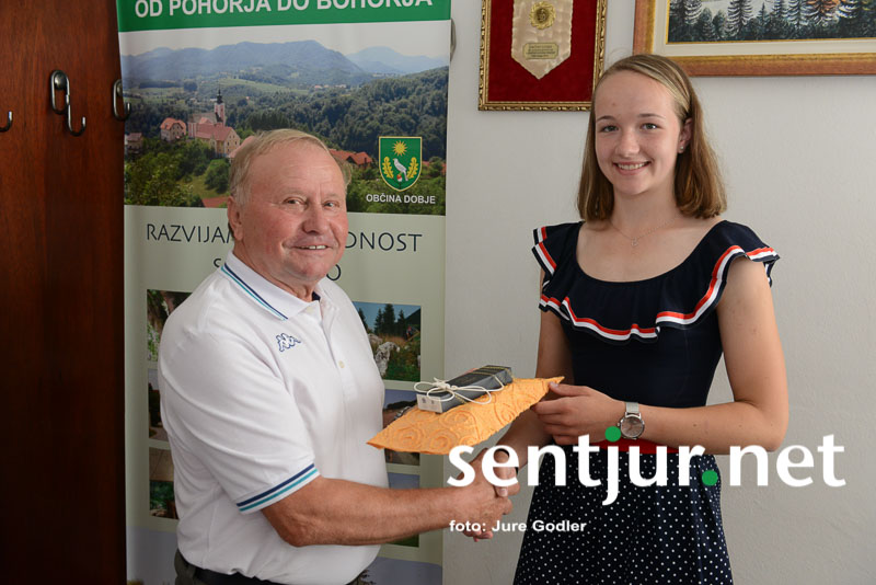 Dobje, 21. junij 2018 – OŠ Dobje se tokrat ravno zaradi majhne generacije učencev – bilo jih je komaj pet – ni morala ravno pohvaliti s številnimi odličnjaki. Vendar je tudi izmed peterice ena učenka vendarle izstopala – Maruša Tovornik. To učenko sta na sprejem k županu Občine Dobje Francu Leskovšku pospremili ravnateljica šole Suzana Plemenitaš in razredničarka Miroslava Minić. Ta je odličnjakinjo pozdravil in ji čestital za dosežen učni uspeh. “V občini smo veseli in ponosni na učne uspehe naših otrok,” je dejal župan ter ji zaželel na njeni nadaljnji poti izobraževanja veliko uspehov. Zaželel ji je, da bo poklic, ki si ga bo izbrala, v življenju tudi z veseljem opravljala, ter ji položil na srce, da pričakuje njeno aktivnost tudi v kraju.