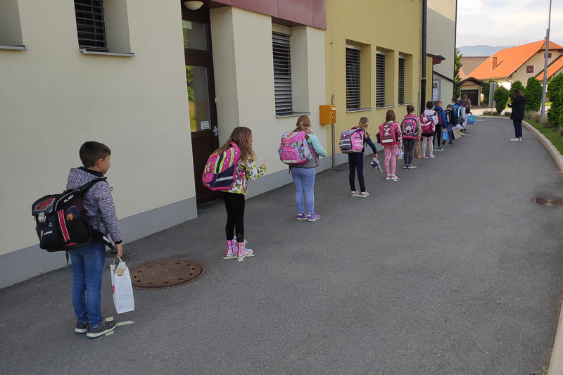 Že zjutraj ob prihodu v šolo so si morali otroci, ki so čakali v kolonah, razkužiti roke in se po šoli gibati po označenih koridorjih. Ob tem pa paziti na predvideno razdaljo do ostalih učencev. Šole so morale razdeliti učence v manjše skupine – do 10 otrok oz. največ 15 otrok. Tako se je po večini naših šol število oddelkov za najmlajše večinoma podvojilo. Zaposleni in učenci, starejši od 12 let, pa morajo nositi vsi zaščitne maske – najmlajšim to ni potrebno. Naslednji teden pa se mogoče v šolo vrnejo tudi devetošolci, pri katerih bodo zaščitne maske obvezne.