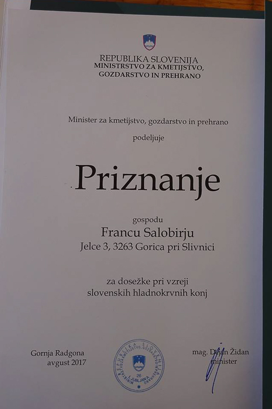 Dogodek se je odvijal na 55. Mednarodnem kmetijsko-živilskem sejmu v Gornji Radgoni, Salobirju pa je na prvem tovrstnem tekmovanju, kjer je razstavljal svoji kobili Sico in Rumenko z žrebeti ter žrebca Jasmina, pometel s konkurenco in od Ministrstva za kmetijstvo prejel priznanje za NAJ rejca slovenske hladokrvne pasme konj. Žrebca Jasmina so v pregi skupaj z žrebcem Kjarom lastnika Petra Zajca iz Višnje Gore na vožnji lahko občudovali številni obiskovalci sejma, kar je izjemna redkost. Lastnikoma pa je bila izkazana že kar ena čast.