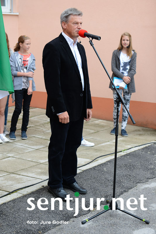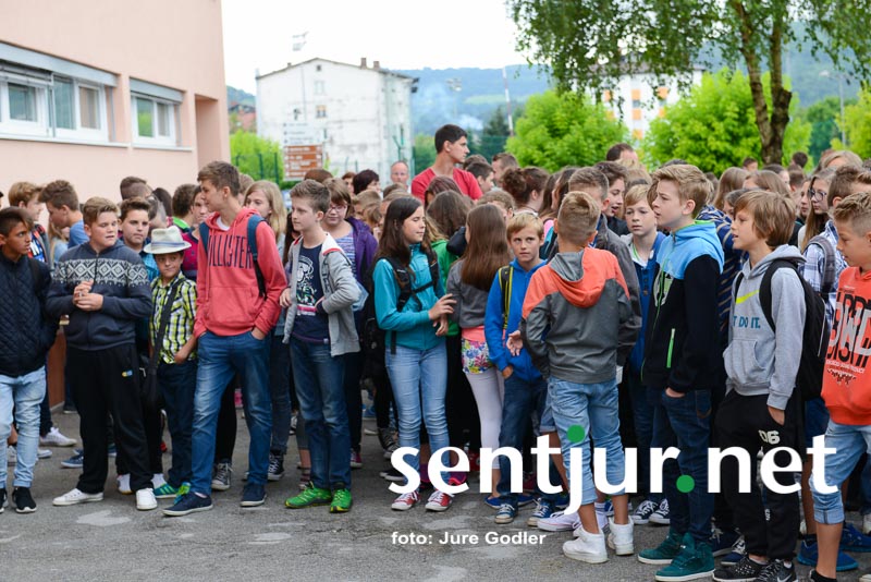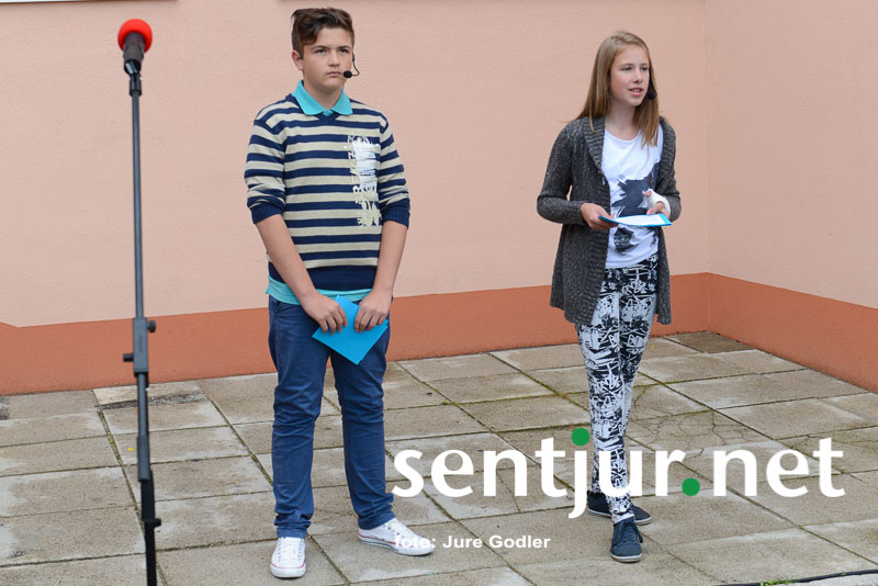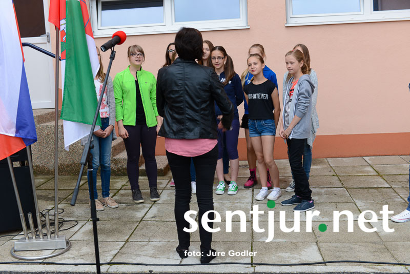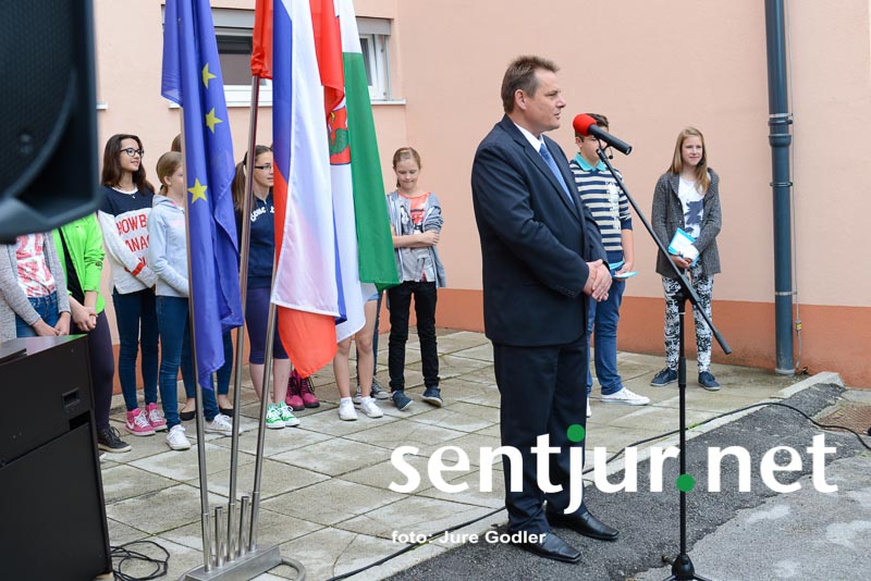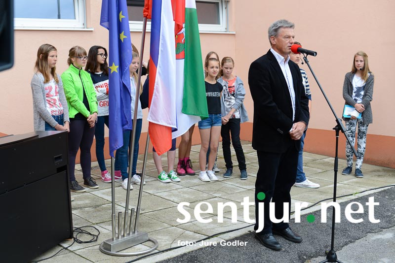 Šentjur, 24. 6. 2015 – S krajšo prireditvijo pred prenovljenim delom šole so na zadnji šolski dan v tem šolskem letu šentjurski šolarji skupaj z županom občine Šentjur mag. Markom Diacijem, predstavniki občinskih služb, izvajalcev del in nadzora v družbi občinskih svetnikov obeležili uspešno zaključen projekt Energetska sanacija OŠ Franja Malgaja Šentjur.