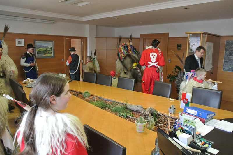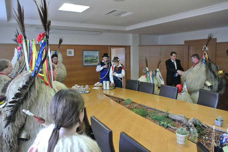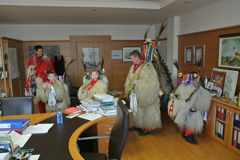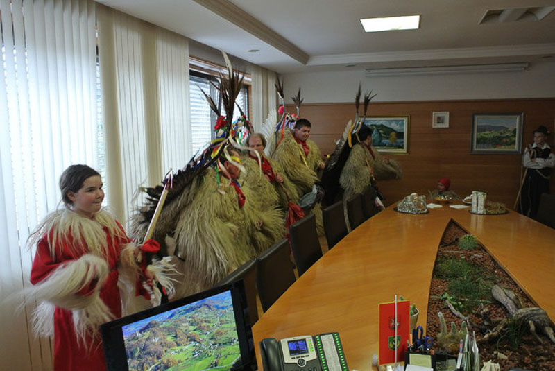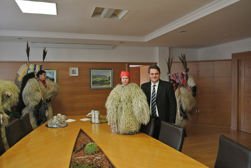 Šentjur, 9. 2. 2015 Tudi letos so zimo najbolj vneto in množično preganjale otroške maske, zagotovo pa se je le-ta prestrašila mogočnih kurentov. S svojimi glasnimi zvonci so na pustni torek naznanili prihod v prostore občine in k županu. Tako se je tudi v Občini Šentjur prijela tradicija kurentovanja, obhoda najbolj značilnega slovenskega pustnega lika s koreninami iz časov naših poganskih prednikov, bogov ter demonov. Kurenti so sicer značilni za vzhodno Slovenijo – območje Ptujskega, Dravsko polje, itd., zato so do pred nekaj leti le redko zašli v naše kraje. Zadnjih nekaj let pa kurente iz svoje domače vasi Pobreže v Šentjur povabi Tone Horvat. S pohodom po Šentjurju so navdušili predvsem najmlajše v šolah in vrtcih, popestrili pa so tudi množično otroško pustno rajanje na Tržnici. Ker po izročilu prinašajo srečo in obilje domačiji ter gospodarju, ki ga obiščejo, jih je na občini z veseljem sprejel tudi župan mag. Marko Diaci. Težke oprave so močno stresali in tako odplesali v pozdrav pomladi ter z dobrimi željami. (vir: Občina Šentjur)
